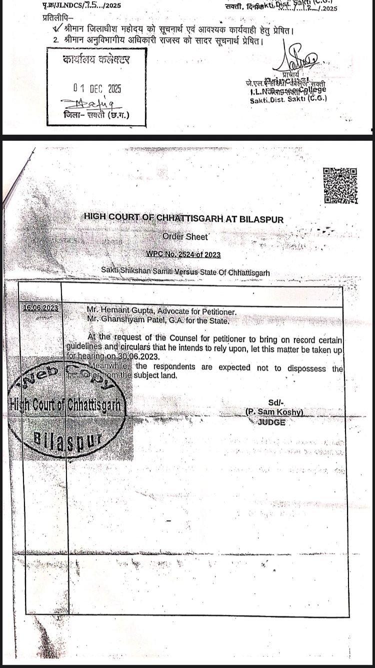 उपरोक्त विषयान्तर्गत लेख है कि आपके द्वारा महाविद्यालय के तोड़े गये अहाता पर खेल परिसर का अवैध बोर्ड नगरपालिका परिषद सक्ती द्वारा लगाया गया है, जबकि माननीय उच्च न्यायालय बिलासपुर द्वारा दिनांक 16.06.2023 को पारित आदेश के तहत महाविद्यालय को वहां से स्थांनातरित या बेदखल नही करने का अंतरिम आदेश प्रदान किया गया था। जब कि आपके द्वारा इस उद्देश्य का अवैध बोर्ड लगाकर माननीय उच्च न्यायालय के आदेश का खुल्लम-खुल्ला उलंघन किया जा रहा है। जो कि माननीय उच्च न्यायालय के आदेश की अहवेलना की श्रेणी में आता है।