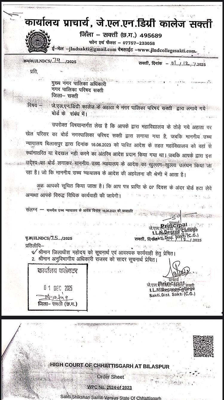 उपरोक्त विषयान्तर्गत लेख है कि आपके द्वारा महाविद्यालय के तोड़े गये अहाता पर खेल परिसर का अवैध बोर्ड नगरपालिका परिषद सक्ती द्वारा लगाया गया है, जबकि माननीय उच्च न्यायालय बिलासपुर द्वारा दिनांक 16.06.2023 को पारित आदेश के तहत महाविद्यालय को वहां से स्थांनातरित या बेदखल नही करने का अंतरिम आदेश प्रदान किया गया था। जब कि आपके द्वारा इस उद्देश्य का अवैध बोर्ड लगाकर माननीय उच्च न्यायालय के आदेश का खुल्लम-खुल्ला उलंघन किया जा रहा है। जो कि माननीय उच्च न्यायालय के आदेश की अहवेलना की श्रेणी में आता है।