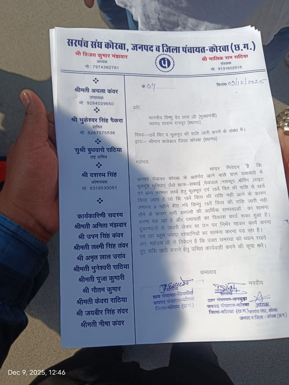 सरपंच संघ जनपद पंचायत कोरबा ने 15 वें वित्त की राशि जारी करने प्रदेश के मुख्यमंत्री के नाम कलेक्टर कोरबा को ज्ञापन सौंपा हैं!