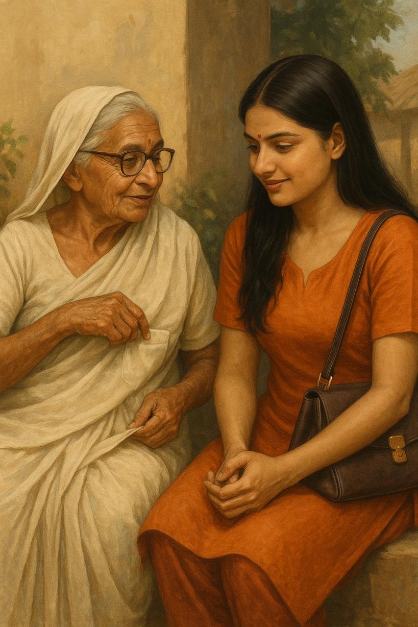 उस दिन मैं लंबे समय बाद गाँव लौटी थी। शहर की भीड़भाड़ और भागदौड़ के बीच, कुछ सुकून की तलाश थी। आँगन में मेरी दादी बैठी थीं — वही सादी सूती साड़ी, आँखों पर पुराना चश्मा, और चेहरे पर वही आत्मविश्वासी शांति। उनके पास बैठकर मैंने राहत की साँस ली।