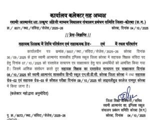 कोरबा :- जिला शिक्षा अधिकारी कोरबा ने जिला में सहायक शिक्षक (संविदा) भर्ती की दस्तावेज सत्यापन और साक्षात्कार की नई तिथि जारी की गई जो दिनाँक 08/10/2025 को स्वामी आत्मानंद शासकीय हिन्दी स्कूल एनसीडीसी कोरबा में होना है!