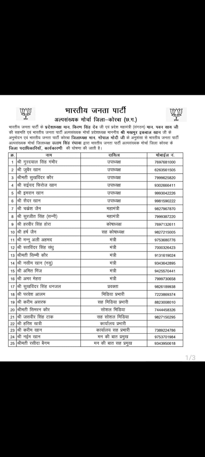 यह नियुक्ति भाजपा प्रदेशाध्यक्ष किरण सिंह देव, प्रदेश महामंत्री (संगठन) पवन साय की सहमति, अल्पसंख्यक मोर्चा प्रदेशाध्यक्ष मखमुर इकबाल खान के अनुमोदन तथा जिला अध्यक्ष गोपाल मोदी की अनुशंसा पर की गई है। जिला अल्पसंख्यक मोर्चा अध्यक्ष उत्तम सिंह रंधावा ने पदाधिकारियों की पूरी सूची जारी करते हुए जुबैर खान के नाम की घोषणा की।