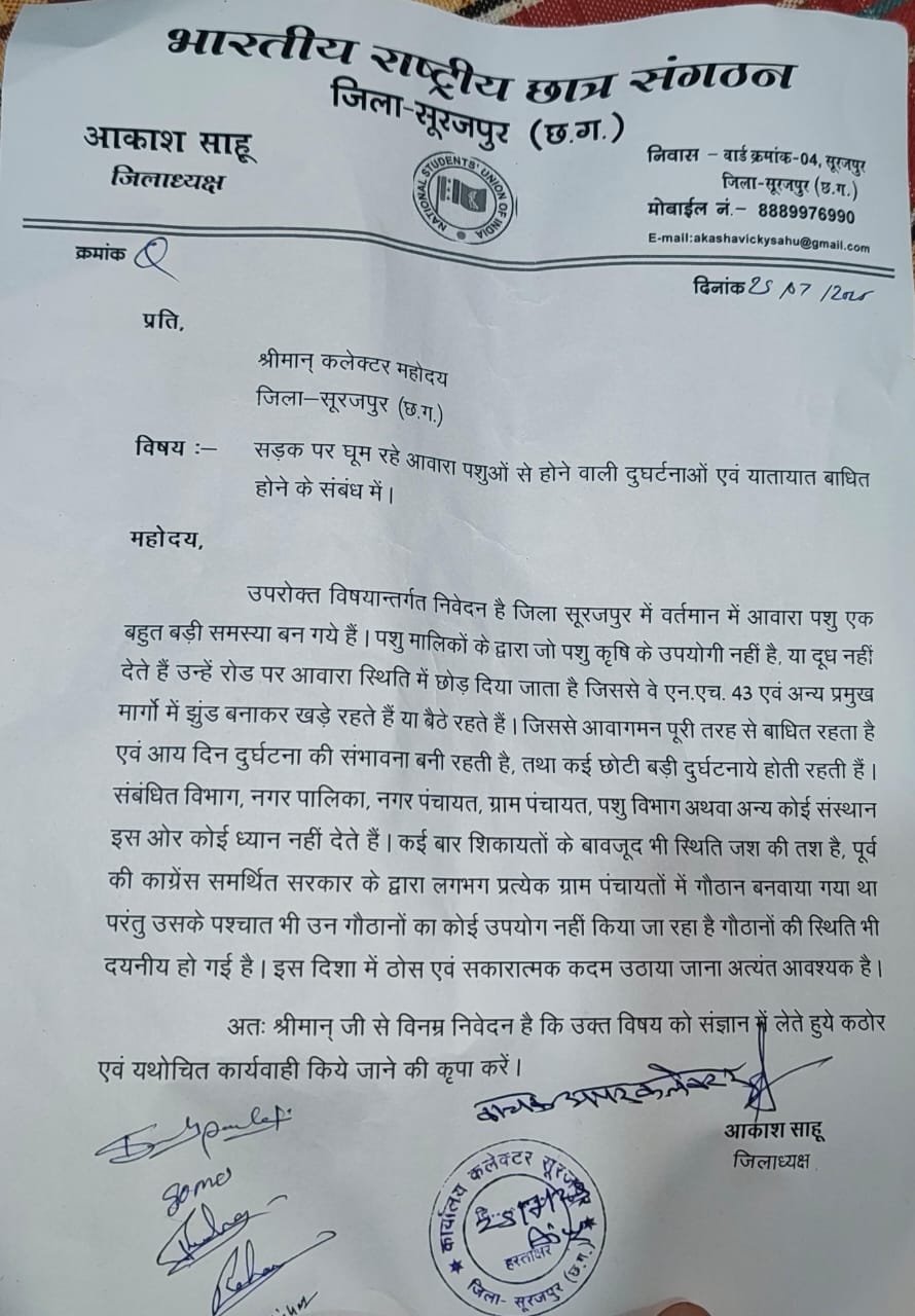 सूरजपुर / वर्तमान में सड़कों पर आवारा पशुओं के जमा होने की समस्या काफी बढ़ती जा रही है दिन- प्रतिदिन दुर्घटनाएं हो रही है इसी के संबंध में एनएसयूआई के जिलाध्यक्ष आकाश साहू ने जिला कलेक्टर को ज्ञापन सौंपकर सड़कों पर घूम रहे आवारा पशुओं की समस्या के समाधान करने की मांग की आकाश साहू ने बताया कि सूरजपुर जिले में वर्तमान में आवारा पशु एक बहुत बड़ी समस्या बन गई है पशु मालिकों के द्वारा जो पशु कृषि उपयोगी नहीं है या दूध नहीं देते है उन्हें रोड में आवारा स्थिति में छोड़ दिया जाता है जिससे एन. एच. 43 एवं अन्य प्रमुख मार्गों में झुंड बनाकर खड़े रहते है या बैठे रहते है जिससे आवागमन पूरी तरह से बाधित रहता है एवं आय दिन दुर्घटना की संभावना बनी रहती है और भी दुर्घटना बनी रहती है संबंधित विभाग,नगर पालिका,नगर पंचायत,पशु विभाग एवं अन्य कोई संस्थान इस ओर कोई ध्यान नहीं देते है कई बार शिकायतों के बावजूद भी स्थिति जश की तश है पूर्व में कांग्रेस सरकार द्वारा लगभग प्रत्येक ग्राम पंचायतो में गौठान बनवाया गया है लेकिन उसके पश्चात भी उन गौठानों का कोई उपयोग नहीं किया जा रहा है गौठानों की स्थिति भी दयनीय हो गई है एनएसयूआई ने इस दिशा में ठोस एवं सकारात्मक कदम उठाने की मांग की है इस दौरान एनएसयूआई के रुद्र प्रताप सिंह,शिवम साहू,प्रदेश सह सचिव लिवनेश सिंह,रेहान,विष्णु साहू,सोमू खान एवं अन्य कार्यकर्ता उपस्थित थे..