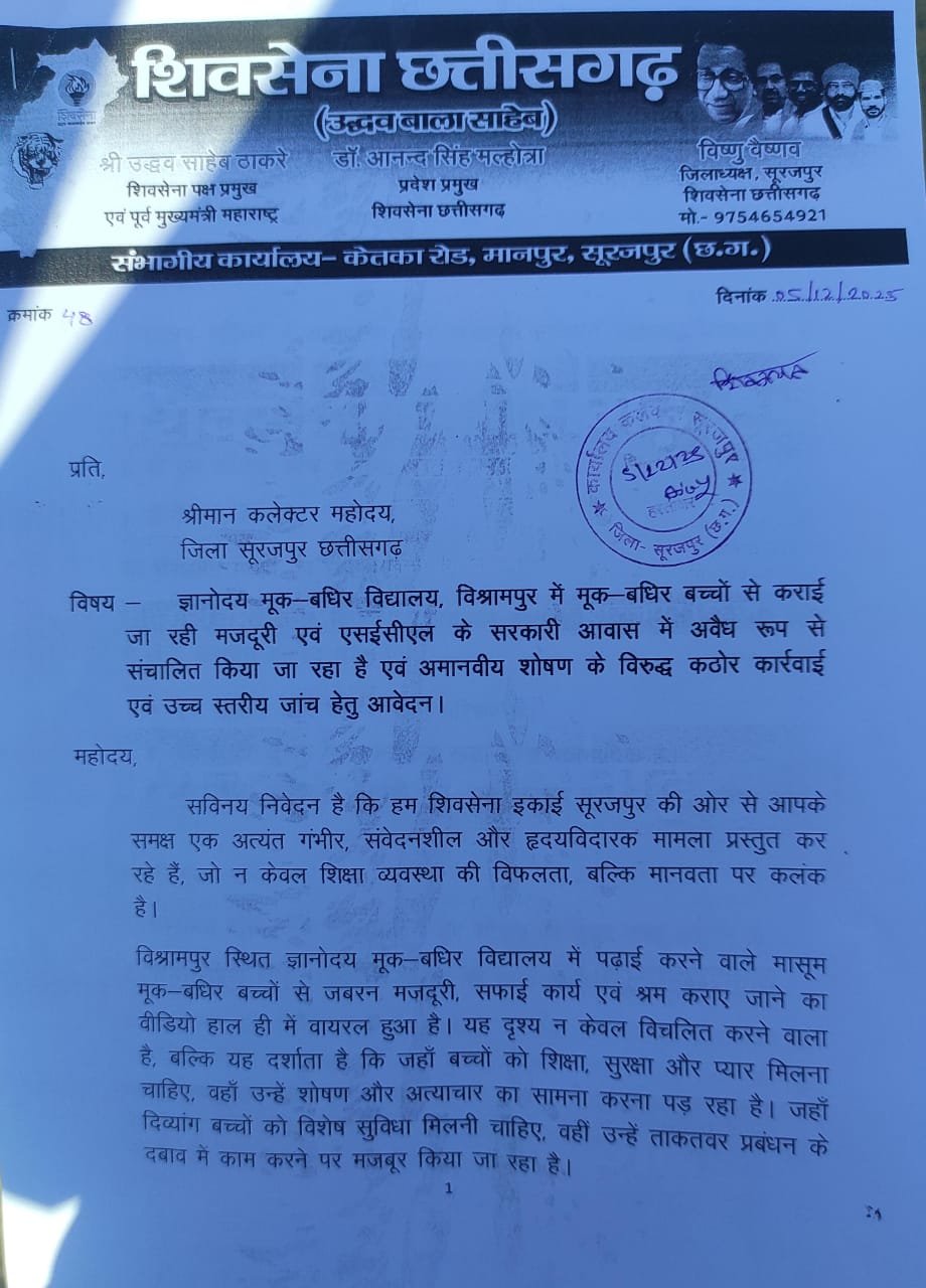 सूरजपुर/ विश्रामपुर/ स्थित ज्ञानोदय मूक-बधिर विद्यालय में दिव्यांग बच्चों से मजदूरी और सफाई कार्य कराए जाने का मामला सामने आने के बाद जिले में हड़कंप मच गया है, इस मामले में अब राजनीतिक मोड भी आ गया है जहां शिवसेना ( उद्धव गुट) के द्वारा कलेक्टर को ज्ञापन सौंप कर कार्रवाई की मांग की गई है।